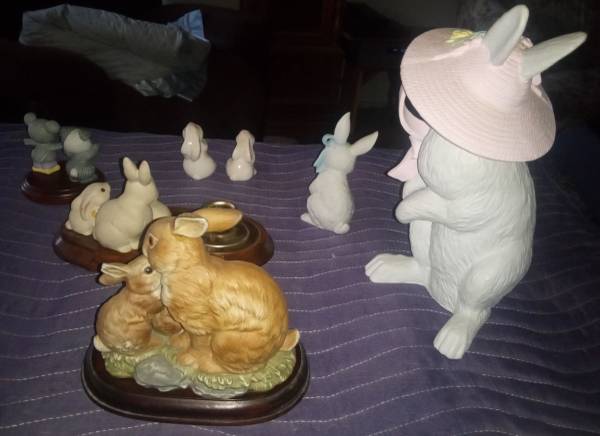 Mostly Easter decor, except for the real-life statue, and the little teddy bear and mouse. I bought the real-life statue for my mom, for her birthday, in 2005. It wasn't cheap. Right after she got it, she dropped it and broke the ear. It doesn't look so bad from straight ahead. I think it's porcelain, so, it can probably be filed to make it look better. I looked up the mama rabbit that's wearing the hat and found it for $95. I didn't look up anything else. There's the mama and two babies, Easter decoration. Salt and pepper shaker. Candle holder. Little teddy bear and mouse. And the statue of the mama and babies. The wooden stands come with them.