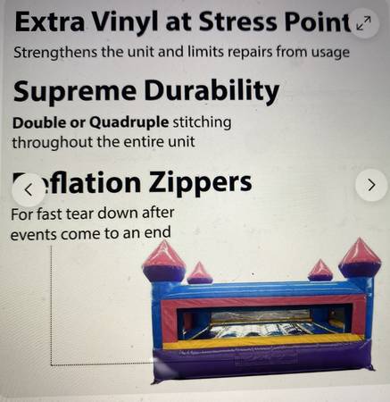 This was set up once for my autistic grandson in the first floor of my house where we have a big space. He could not stand the sound of the motor so my husband rigged up a system to have the motor outside the window. My grandson still refused to use it. It was turned on twice and he jumped on just a few times before that was the end of it. With tax it runs for $1500. We are asking $1000 firm. We can blow it up when you arrive so you can make sure all is in order and there are no signs of use.